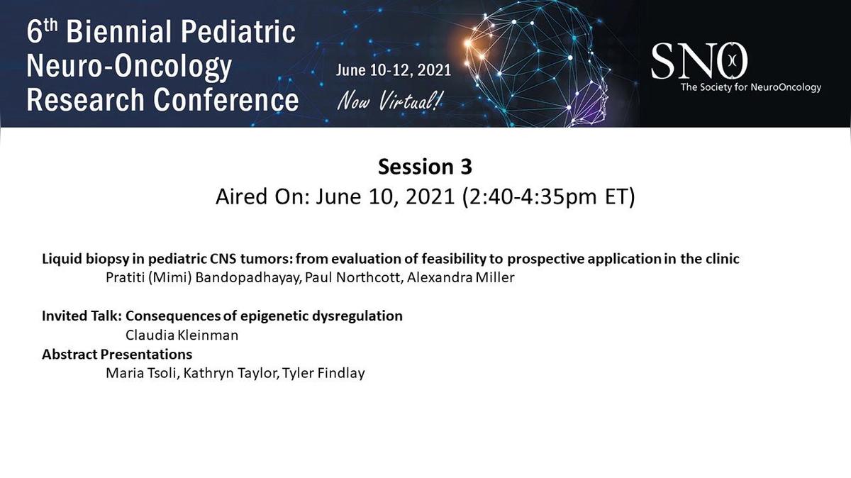 Session 3 Aired On: June 10, 2021 (2:40-4:35pm ET) Liquid biopsy in pediatric CNS tumors: from evaluation of feasibility to prospective application in the clinic Pratiti (Mimi) Bandopadhayay Paul Northcott Alexandra Miller Invited Talk: Consequences of epigenetic dysregulation Claud...